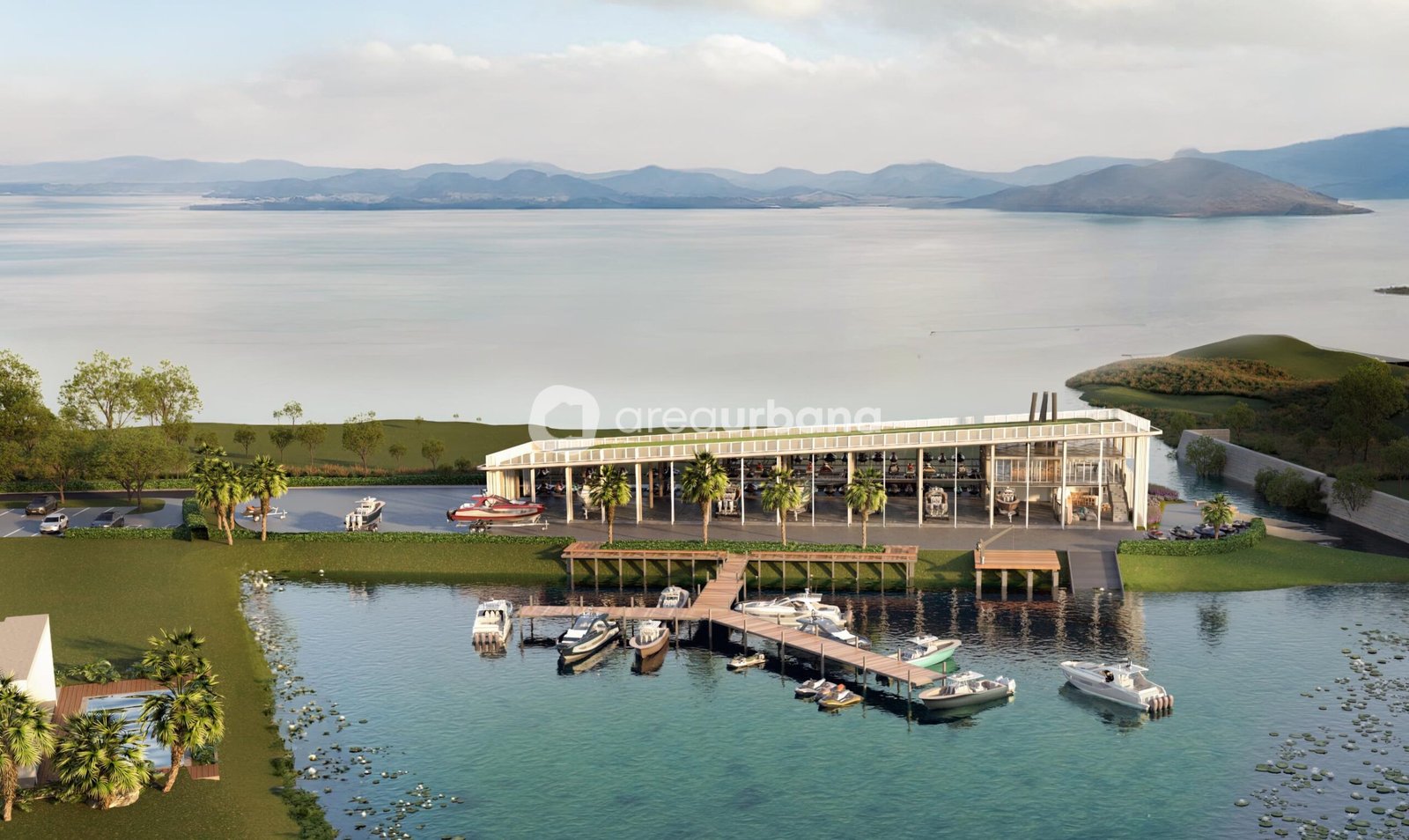 • Cobertura da marina com gramado e vista para a lagoa e serra ⛰